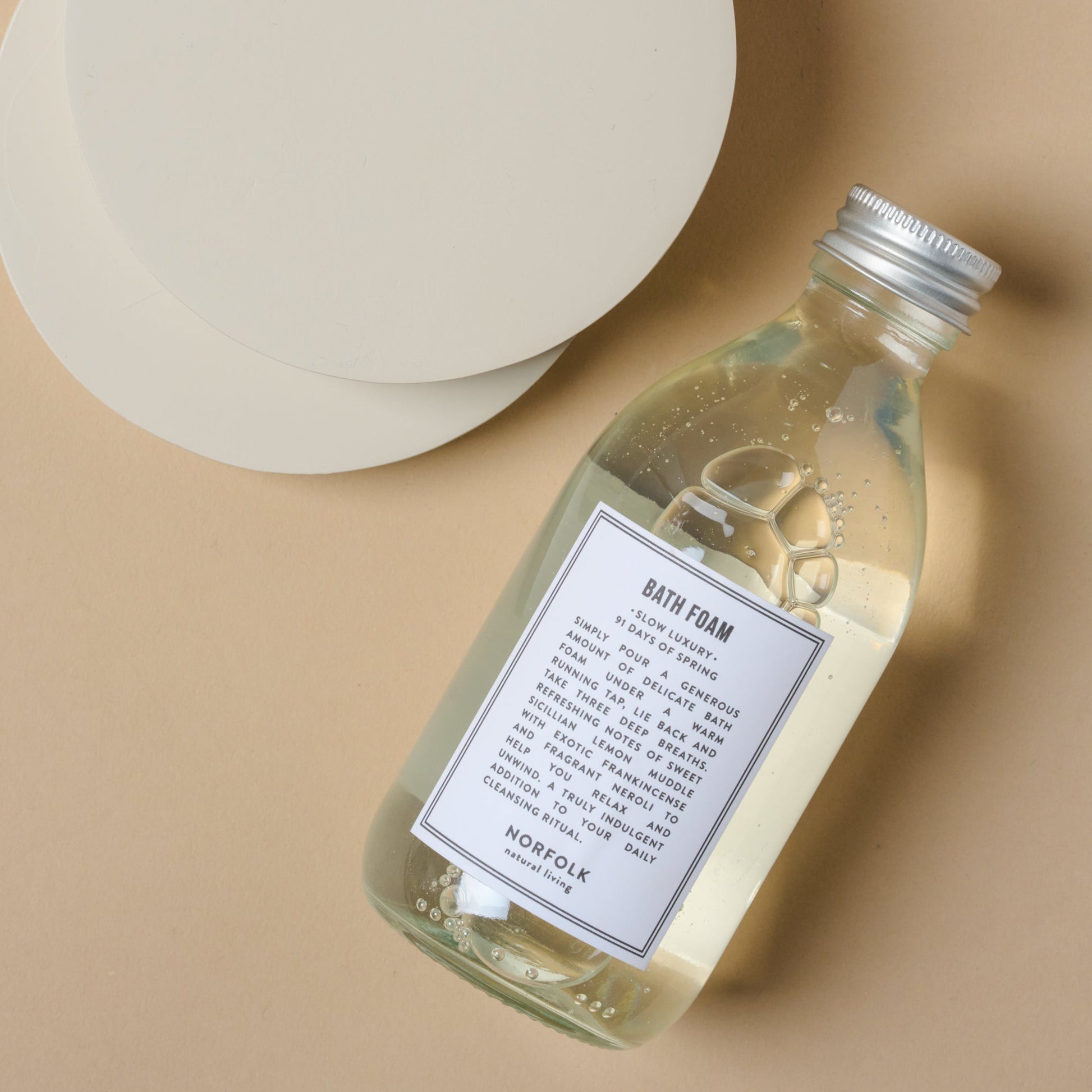 Sink into a luxurious bubble bath with the Norfolk Natural Living Bath Foam. Formulated with all-good ingredients, this foam is a bright addition to any cleansing routine and is scented with the well-loved 91 Days of Spring scent—including citrus, jasmine, and frankincense essential oils. Pour a small amount under warm running tap water to activate foam.