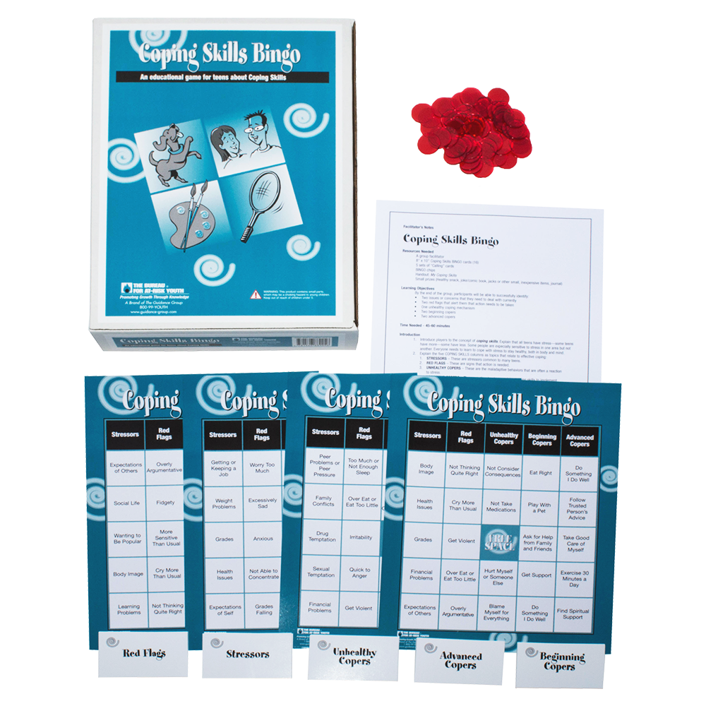 Coping Skills Bingo helps participants learn how to cope with stress. Participants will learn how to identify stressful situations, beginner and advanced coping strategies, and unhealthy coping mechanisms.