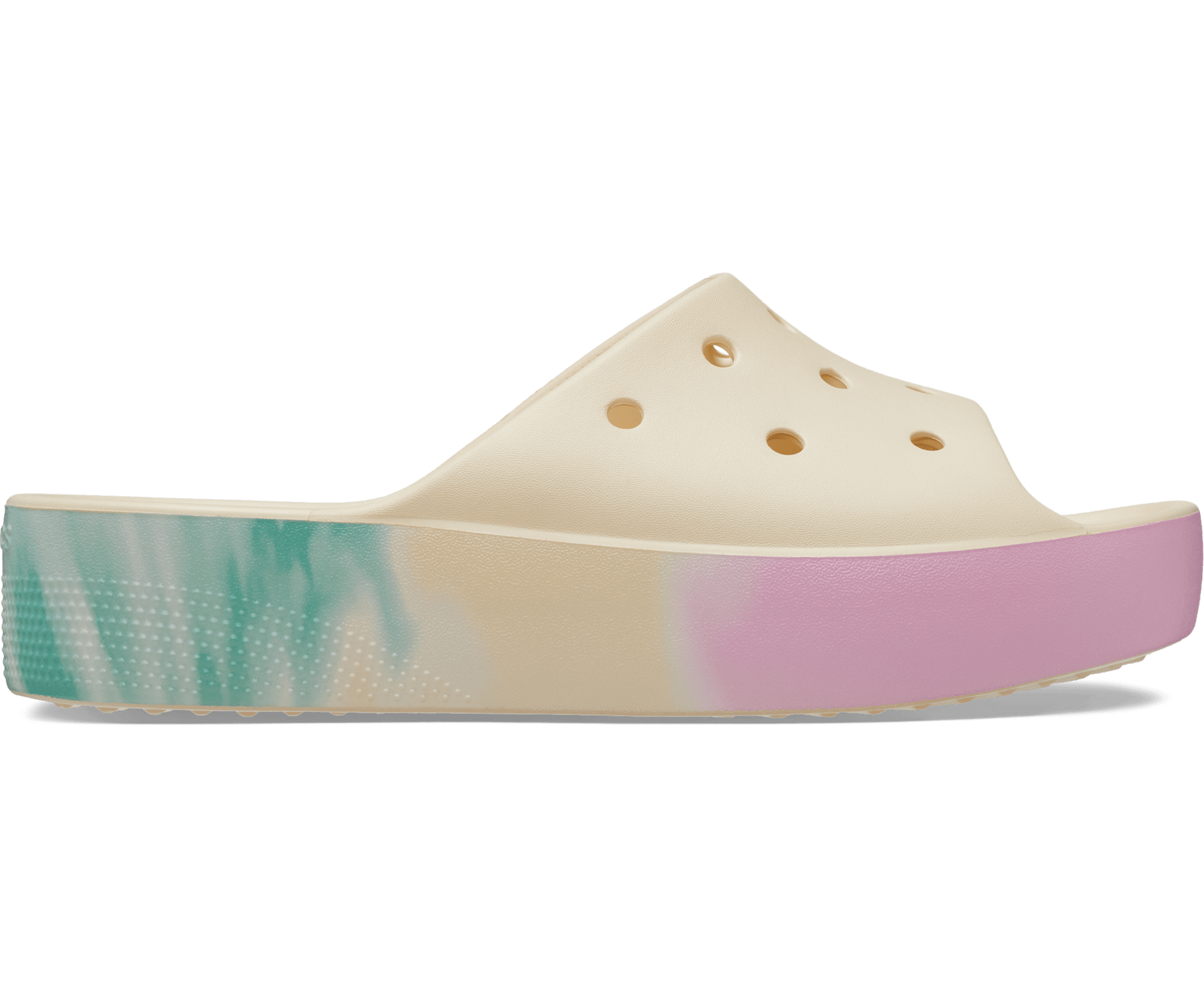 Enjoy this stylish revamp of our Classic Crocs Slide that features a platform silhouette, textured heel and a unique ombre graphic. Plus, holes in the upper allow for personalization with Jibbitz™ charms. Classic Croslite™ foam cushions each step and keeps them light and easy to wear. Comfortable sandals, with elevated style.