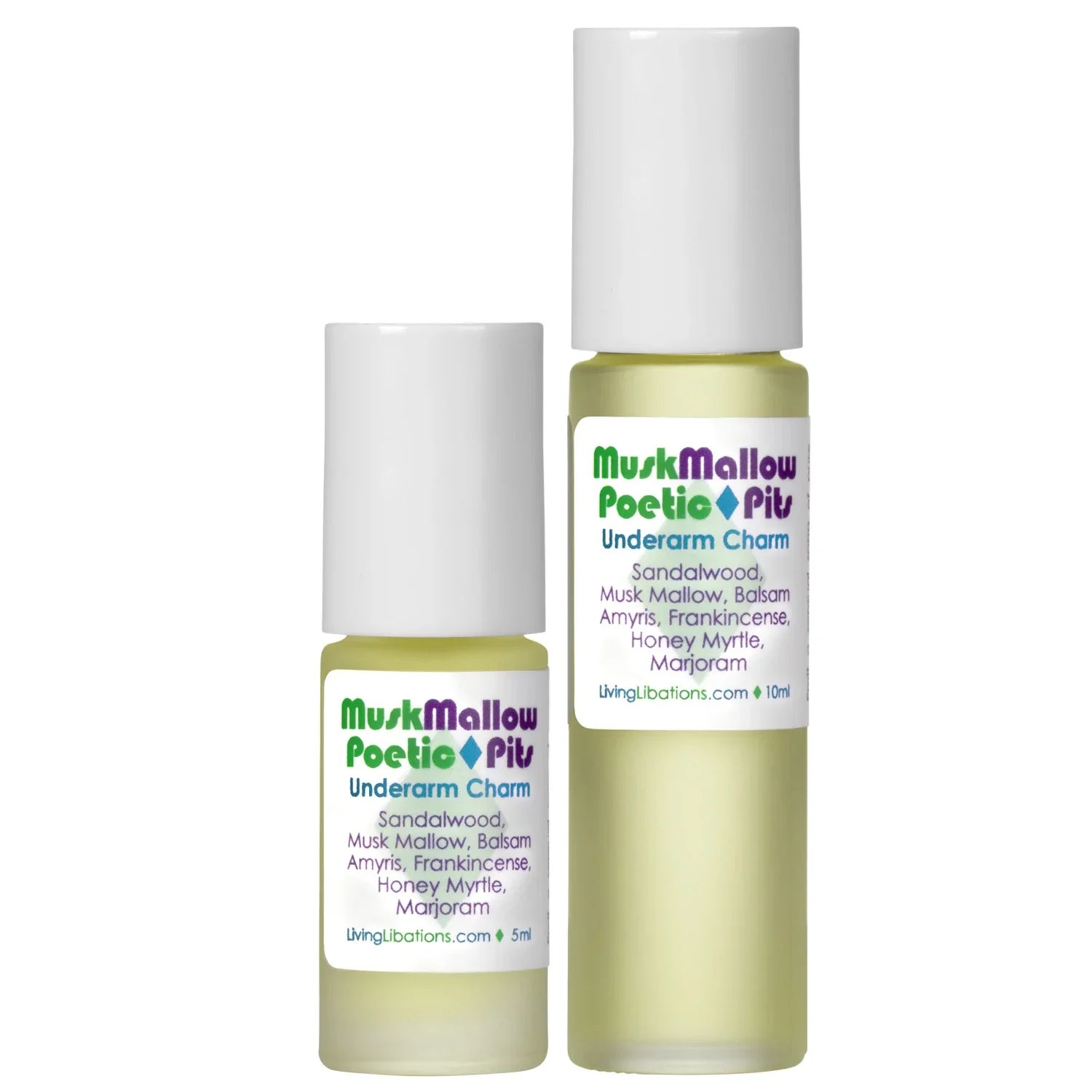 Living Libations Musk Mallow Poetic Pits was created to arouse your underarms with poetic aromas of love and bliss. Emit a sensual song of pure plant poetry from your pits! Featuring copal, sandalwood and musk mallow essences, Musk Mallow Poetic Pits creates a spirited tantric-triple-threat of arousing euphoria. It contains skin-soothing and sensual attractant properties to keep your underarms smooth, fresh, and fabulously fragrant.