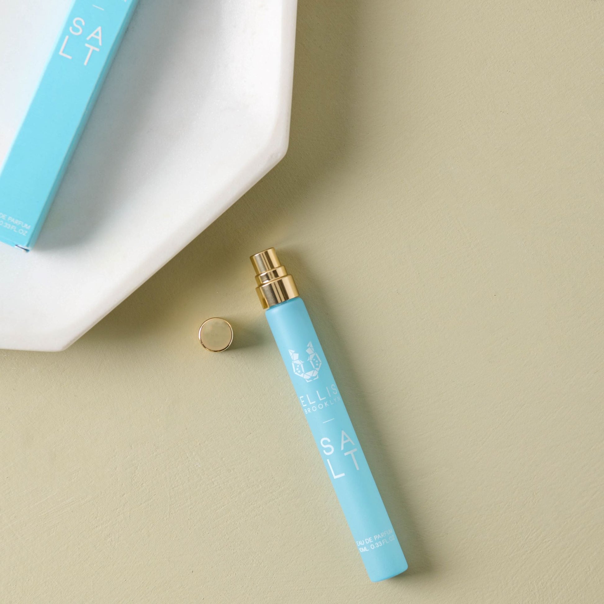 The Salt Eau De Parfum features the scent of vegan ambergris and the tropical floral notes of Tahitian tiare mixed with sandalwood and musk. Made with clean ingredients, this fragrance is soft and sophisticated. Available in both a large and travel spray.