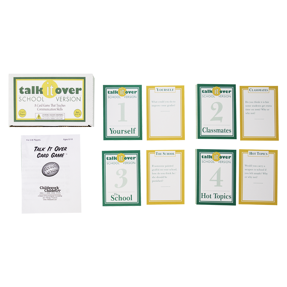 Designed to be played in the classroom or in a counseling session, the game contains four decks of cards: Yourself, Your Classmates, Your School, and Hot Topics.
